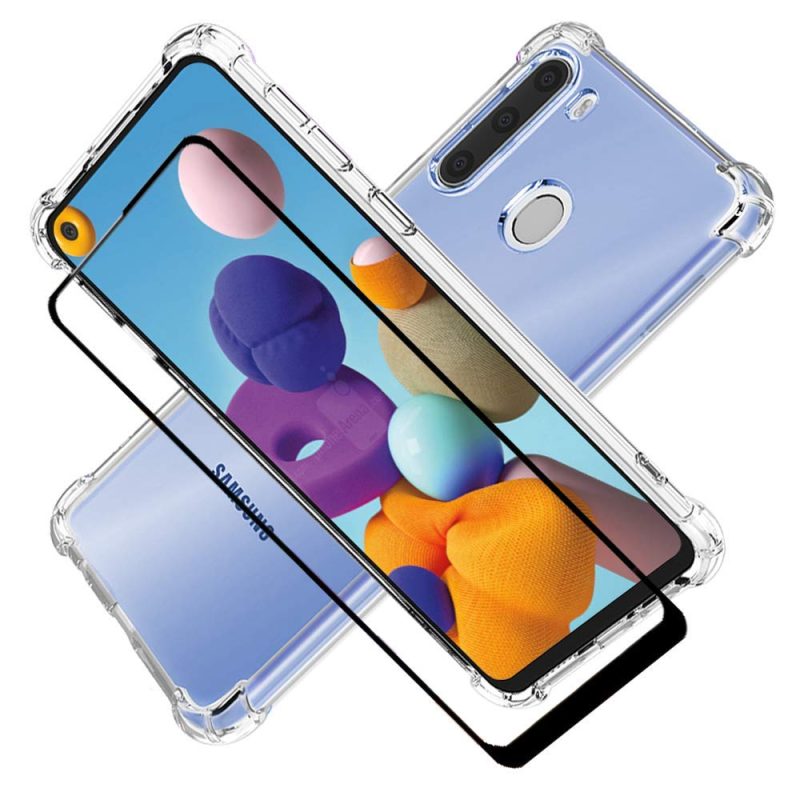 Slim clear TPU case for Galaxy A21 with shock protection and raised edge design.